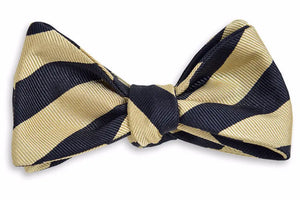 About This Item: As a part of our All American collection, this striped bow tie features a two-toned black and gold combo. Traditionally, this color pairing is known for its subtle elegance, along with the ability to project luxury. In addition, these two solid colors are often known to represent schools, universities and alumni across the nation. However, this self tying option doesn’t just flaunt its looks. It also possesses our exclusive Italian woven silk fabric that’s ribbed and lightweight.