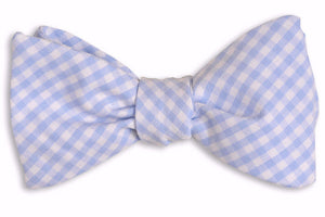 A cotton gingham bow tie in classic carolina blue and white. The timeless gingham pattern works equally well at a summer wedding, garden party, or dressed up for more formal occasions. Handcrafted in North Carolina.