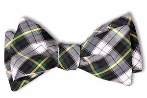 Bring timeless elegance to your holiday wardrobe with our Snowcapped Plaid Bow Tie. This stunning 100% cotton tartan features a sophisticated palette of deep navy, forest green, and charcoal grey, accented with crisp white and gold stripes that catch the light beautifully.