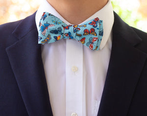 The butterflies, depicted in an array of blues, add a touch of elegance and creativity to the design. Handmade with care in North Carolina, this bow tie is a testament to both quality and style.
