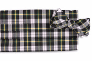Elevate your formal look with our Snowcapped Plaid Cummerbund & Bow Tie Set. This stunning 100% cotton tartan features deep navy, forest green, and charcoal grey accented with crisp white and gold stripes—perfectly complementing a black tuxedo.