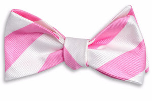About This Item: From unique patterns to individual knots, the bow tie is all about self-expression, and what better way to make a statement than with a bright pink stripe! Our True Pink and White Stripe bow tie is a stylish accessory that can work for both formal and informal events and occasions. Versatile enough to dress up, or down, this pink striped bow tie is the perfect balance of spring color any guy can wear with confidence! Woven out of some of the finest quality silk in the world, and hand cut and sewn in the South.