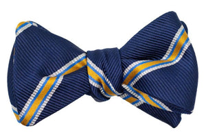 Elevate your wardrobe with the Skyline Stripe silk bow tie. Featuring crisp white, gold, and baby blue stripes, this tie captures the essence of a city skyline at sunrise. Perfect for boardroom meetings or evening outings, it adds a subtle yet sophisticated touch to any suit. Refined, versatile, and crafted from premium silk, Skyline Stripe is a standout choice for the modern man who appreciates classic style with a fresh twist.