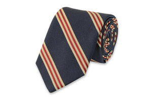 Reach for the Cambridge Stripe Necktie when you want to add a touch of sophistication and class to your look. Crafted from luxurious Italian silk, this stylish tri-stripe tie features bold colors of navy blue, gold, and burgundy. Sewn to perfection in North Carolina, this timeless piece is sure to become a favorite for any occasion. Look sharp and feel confident in the Cambridge Stripe Necktie!