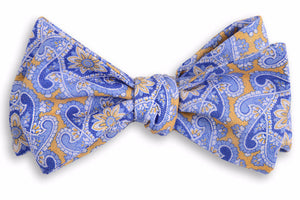 About This Item: Inspired by the first leg of the American Triple Crown, the Yellow Derby Paisley Bow Tie is a festive and vibrant celebration of floral spring patterns and skillfully shaped teardrop motifs. Featuring a colorful medley of sky blue hues and canary yellow, this ultra-fashionable bow tie stands out on its own. This accessory is handwoven together with 100% linen, and flaunts an impressive marriage of fabric, design and color ideal for the stylishly dressed man.